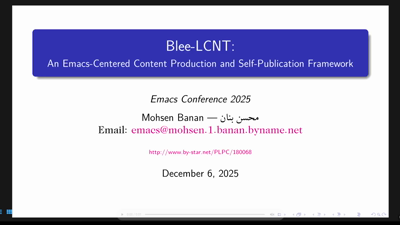 00:05.760 Introduction 01:20.080 Scope: A complete multi-media content processing framework 02:10.320 Prior art and similar art 03:02.420 LaTeX-Beamer + Reveal.js with Blee and BISOS 03:57.160 Blee-LCNT novel concepts 05:12.520 Part of a bigger picture - part of a series 06:32.560 Nature of polyexistentials 12:52.640 Content processing - a ByStar/BISOS/Blee Capability Bundle (BCB) 14:23.120 ByStar containment hierarchy and ByStar capability bundles 14:31.280 Aggregated conviviality of ByStar capabilities 15:22.000 Parts list: integrated components 15:47.868 Resulting contents - output forms and formats 18:45.720 reveal.js 20:31.980 Generating the video 21:33.480 A unified single input -- a sequencef of frames 22:39.180 Abstractions to keep in mind 23:16.200 Frame control types 24:24.360 How outputs are generate from the inputs 26:25.200 Context for unified source walkthrough 27:46.480 One slide 29:24.080 Dynamic blocks 31:05.800 Internationalization - a non-Americanist perspective 33:42.280 Autonomous self-publication and federated re-publications 35:07.720 Ingredients of BISOS platforms and their progression 36:02.560 Moving forward