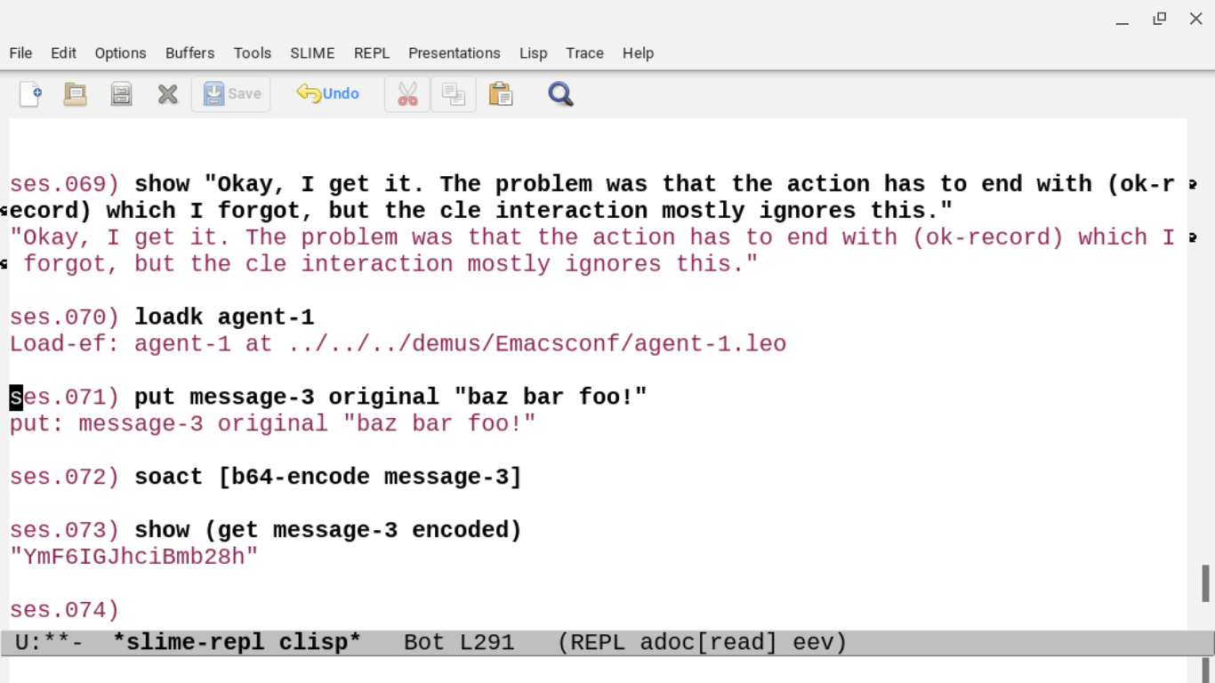 00:00.000 Opening 02:08.240 Q: What do you mean by "the agent is running slowly"? 03:00.640 Q: Do you think that it would be too hard to add a second way to send commands from Common Lisp to Emacs? 06:37.760 Q: What is the leonardo system? 09:27.280 Q: What is LambdaMOO, and how do we use it? 11:01.340 Q: It seems like you're trying to build a more restrictive Turing test using the input / output logs of an emacs conversation. Is that accurate? 15:52.160 Q: What do you mean by slowly?Duration: 18:24 minutes