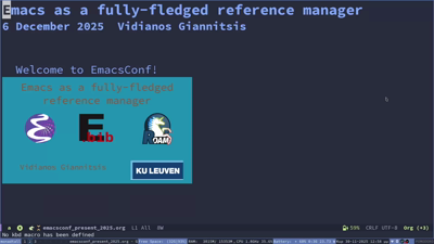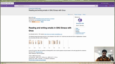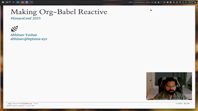 00:15.640 Q: I'm excited to know opinion on current state of using MCP and AI for PKM and PIEs. Since they do carry lot of burden out of us and ease lot of process. How does hyperbole stand with coming days? 02:54.200 Q: As a normal user who codes and takes notes, I really want to deep-dive and learn Hyperbole, but always end up winding back up to embark and org-mode being the better system. For me hyperbole looks like over-engineered (or over-configured) system which other individual packages do well. And outside emacs there is no system supporting hyperbole nor any usability. 05:13.640 Implicit buttons 06:43.840 Getting help 09:12.080 Explicit buttons 09:42.960 Homepage 11:41.540 Q: I've been using "activities.el" and "Bufferlo" to save dedicated workspaces (open buffers, window positions) in tabs and frames for tasks/projects across Emacs sessions. Could I do something similar with Hyperbole? 14:07.120 Q: How well do Hyperbole and org-mode work together? Is there any kind of integration? 16:16.400 Hywiki 22:06.440 Q: Are there any talks from this year's emacsconf that discussed things that would work well with Hyperbole? 26:05.840 Interesting, but the many different link formats makes reading and analyzing my notes much harder and less usable outside Emacs. 28:51.400 Koutliner 33:02.840 Org tables 34:43.280 Selecting between delimiters 36:43.080 Ace-window 38:01.200 Dired 38:42.240 Controlling windows or frames 40:04.960 Documentation 40:41.520 Videos 42:09.040 ManualDuration: 47:09 minutes