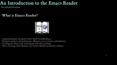 00:00.720 An introduction to the Emacs reader 00:44.760 Yet another document viewer in Emacs? 02:05.760 Architecture of Emacs Reader 06:00.280 A word on dynamic modules 07:39.560 Features of Emacs Reader 07:56.760 Memory efficiency 11:18.720 Performance and speed 14:23.680 Scanned PDFs 17:08.960 System-level multi-threading 23:44.240 Native Emacs integrations 25:10.340 (Naive) dark mode 26:01.140 Challenges and further improvements 29:14.272 What Emacs can learn? 32:32.300 Contributing to the development 33:35.520 Acknowledgements
